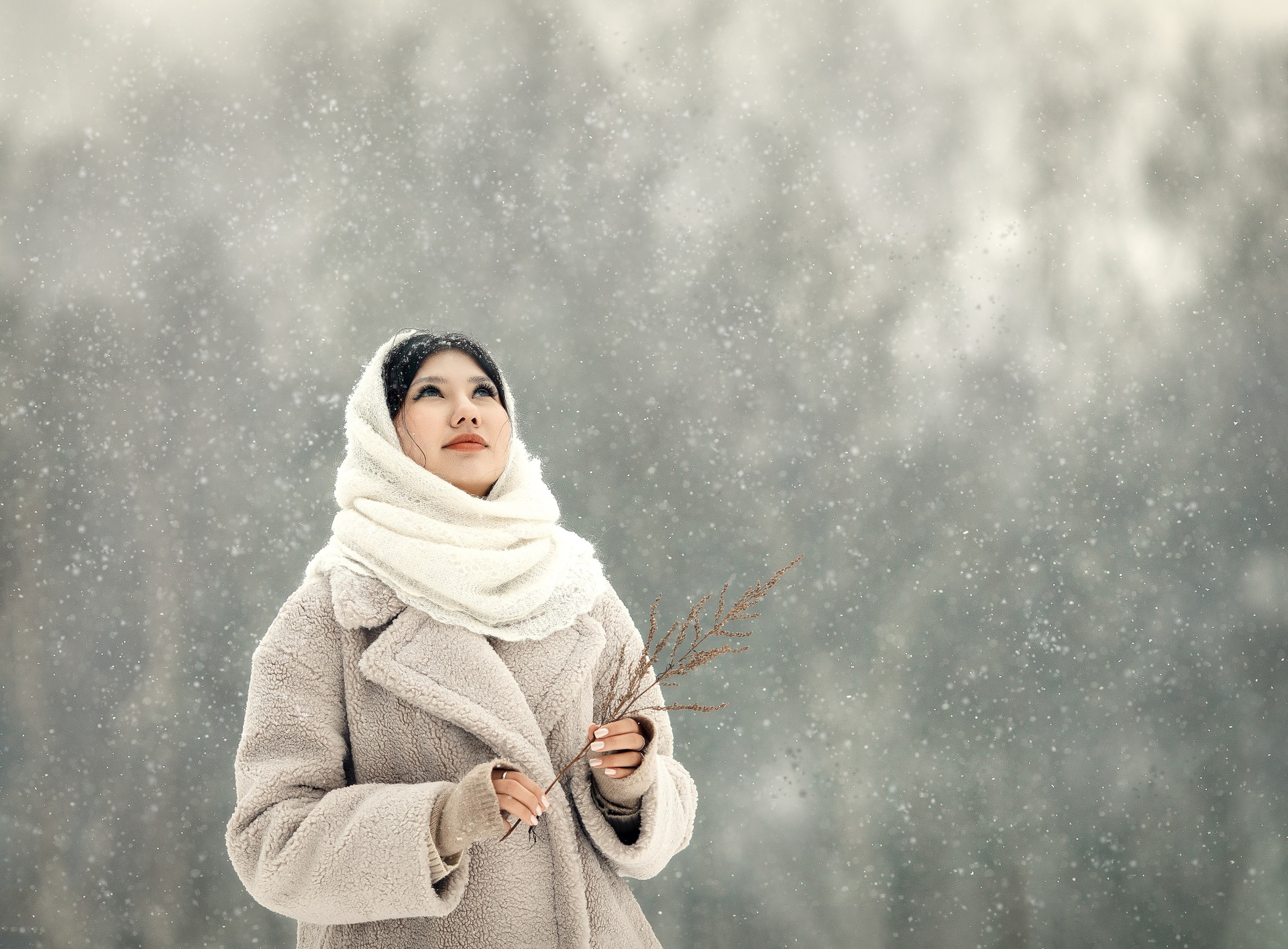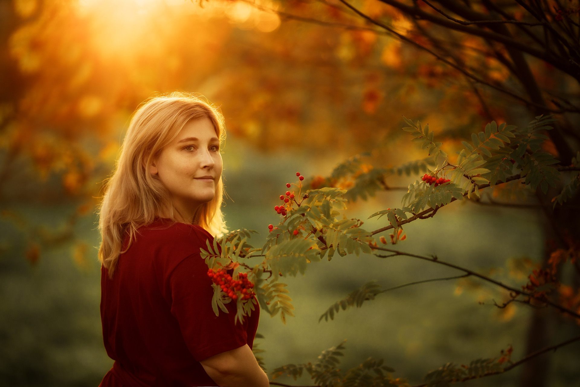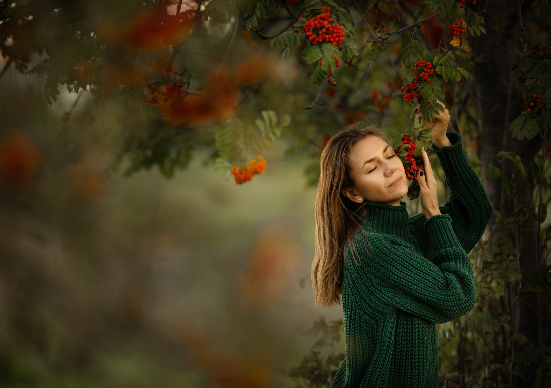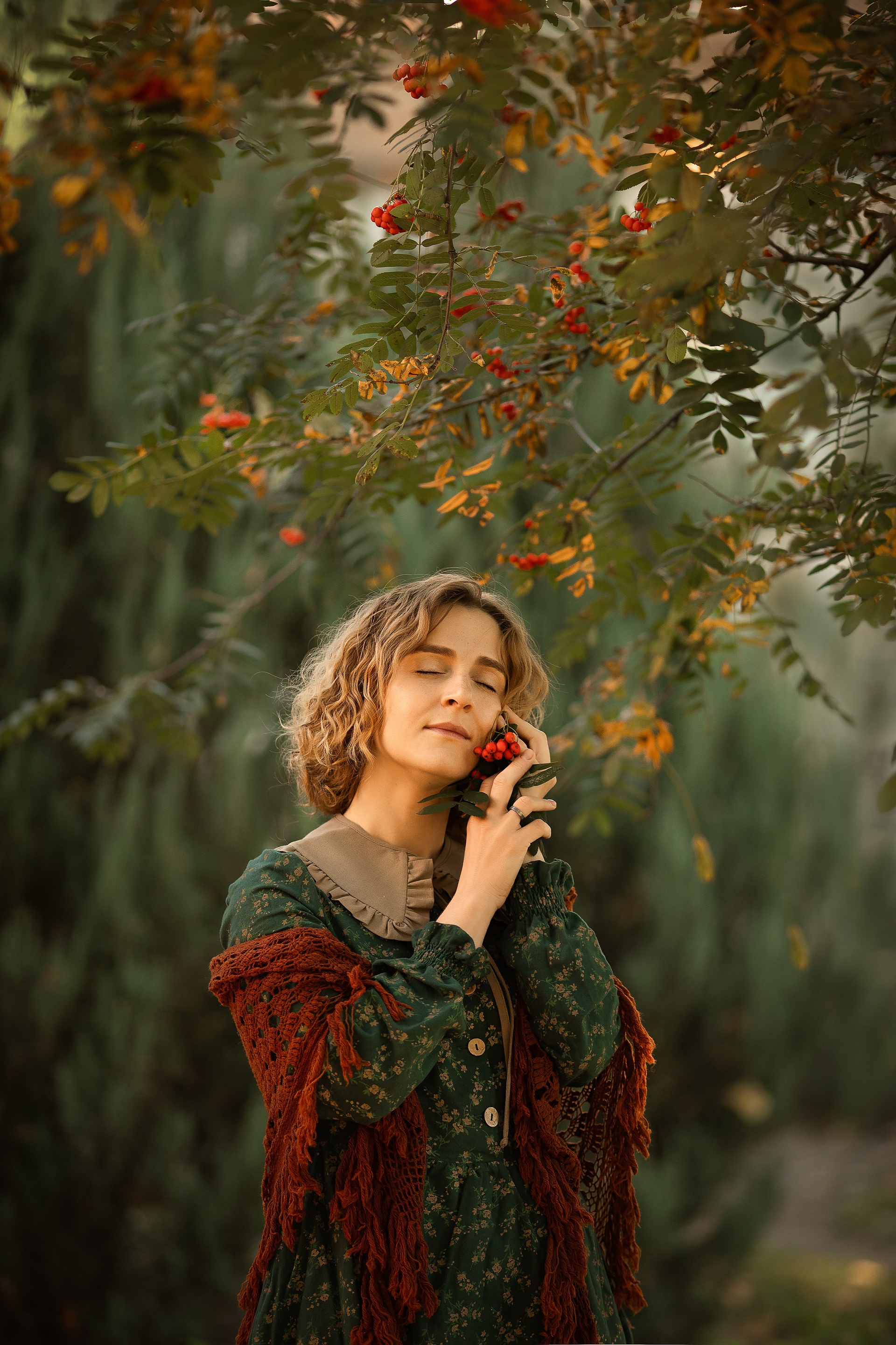 Фотосессия девушки в рябине. Пасмурная погода